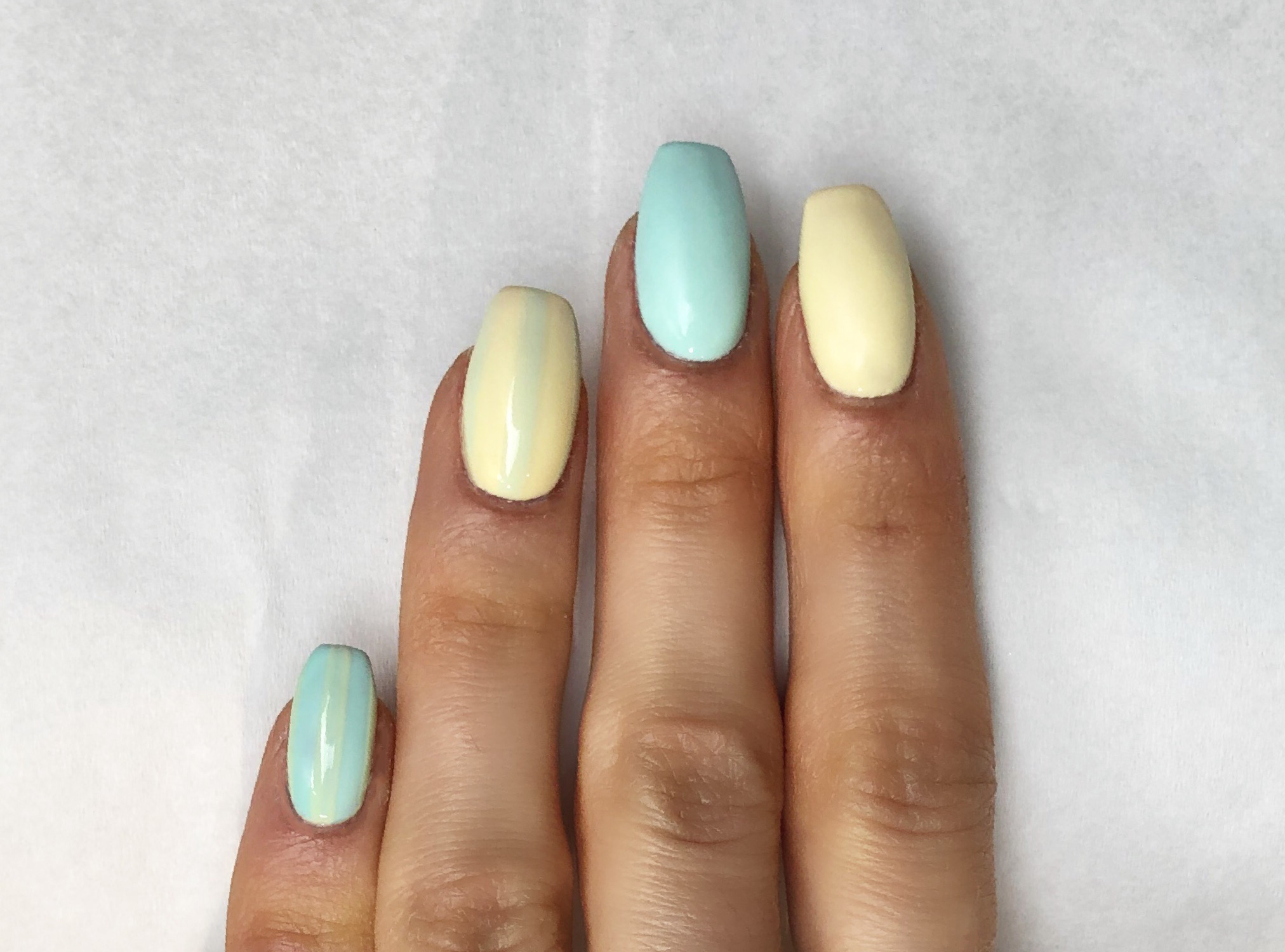 Step 3: With a medium liner brush slightly flattened, create three wide vertical stripes on the ring finger using Gellux I Sea You and Aloha Honolulu for the ring finger and little finger making sure you apply very thinly, then cure.