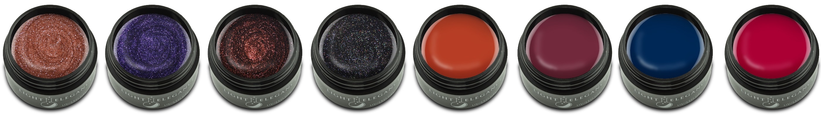 The Spice collection includes six coloured gels in cranberry, pumpkin orange, a berry pink, a berry mauve, and denim blue. The six Glitter gels come in multi blue, medium brown with copper, metallic paprika orange, black purple, rosy neutral, and black with flashes of red, green, purple, orange and yellow.