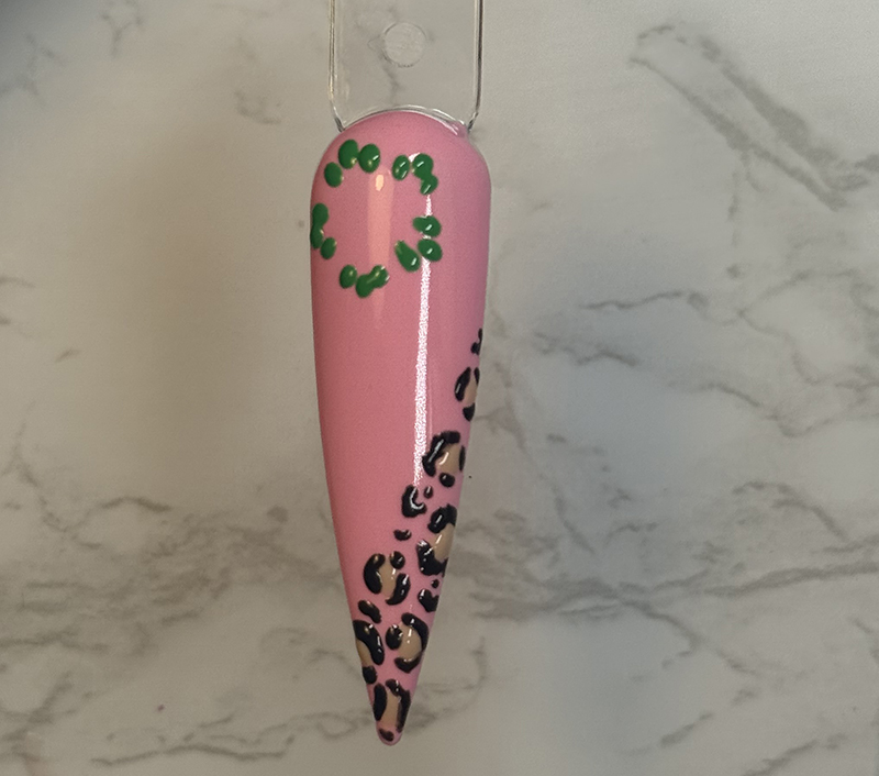 Step #3. Using your dotting tool or detail brush, outline each nude spot with two or three wiggly C shape black lines to create the leopard print design.