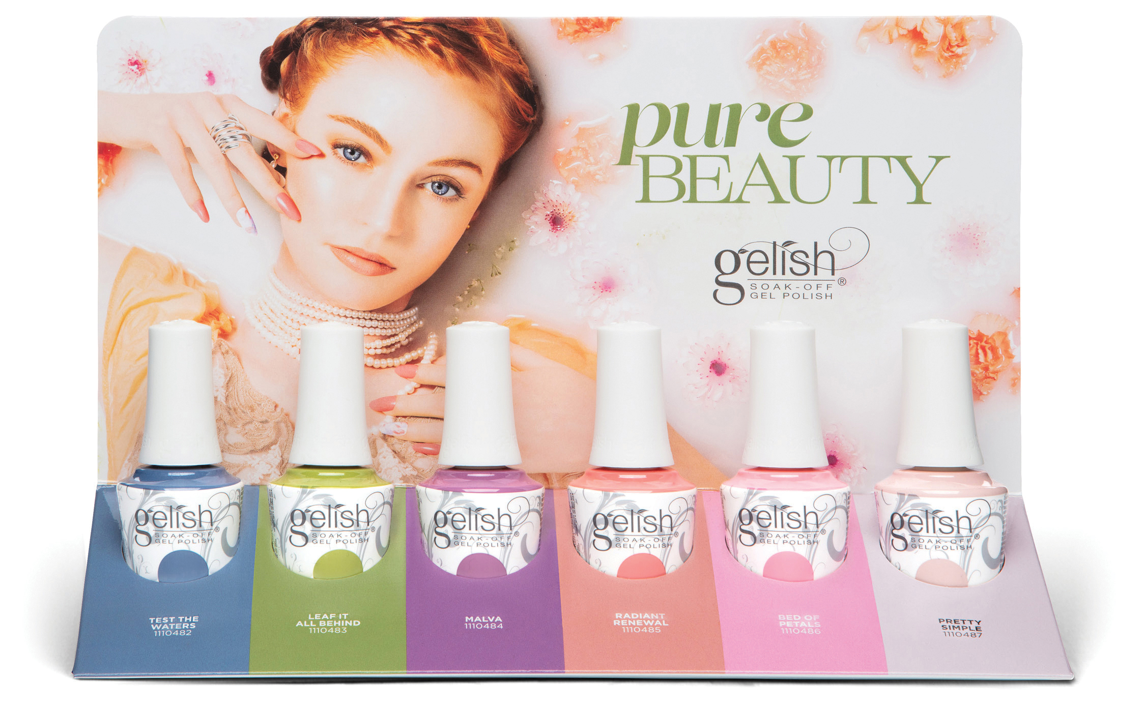 The new colours are available in both Gelish Soak Off Gel Polish 15ml, Morgan Taylor 15ml and Gelish Dip Express Powder formulations. Hues include Test the Waters, slate blue crème; Leaf It All Behind, a moss green crème; Malva, a purple crème; Radiant Renewal, a dusty coral crème; Bed of Petals, a bright pink crème; and Pretty Simple, a light nude crème.