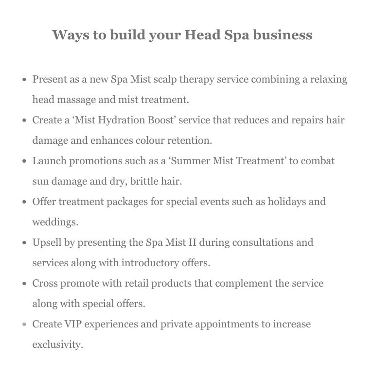 For example, Spa Mist II allows for the introduction of hand and nail conditioning treatments and enhanced colour outcomes, which can work in perfect synergy with head spa services. The opportunities are there for salons to really maximise their growth potential.”