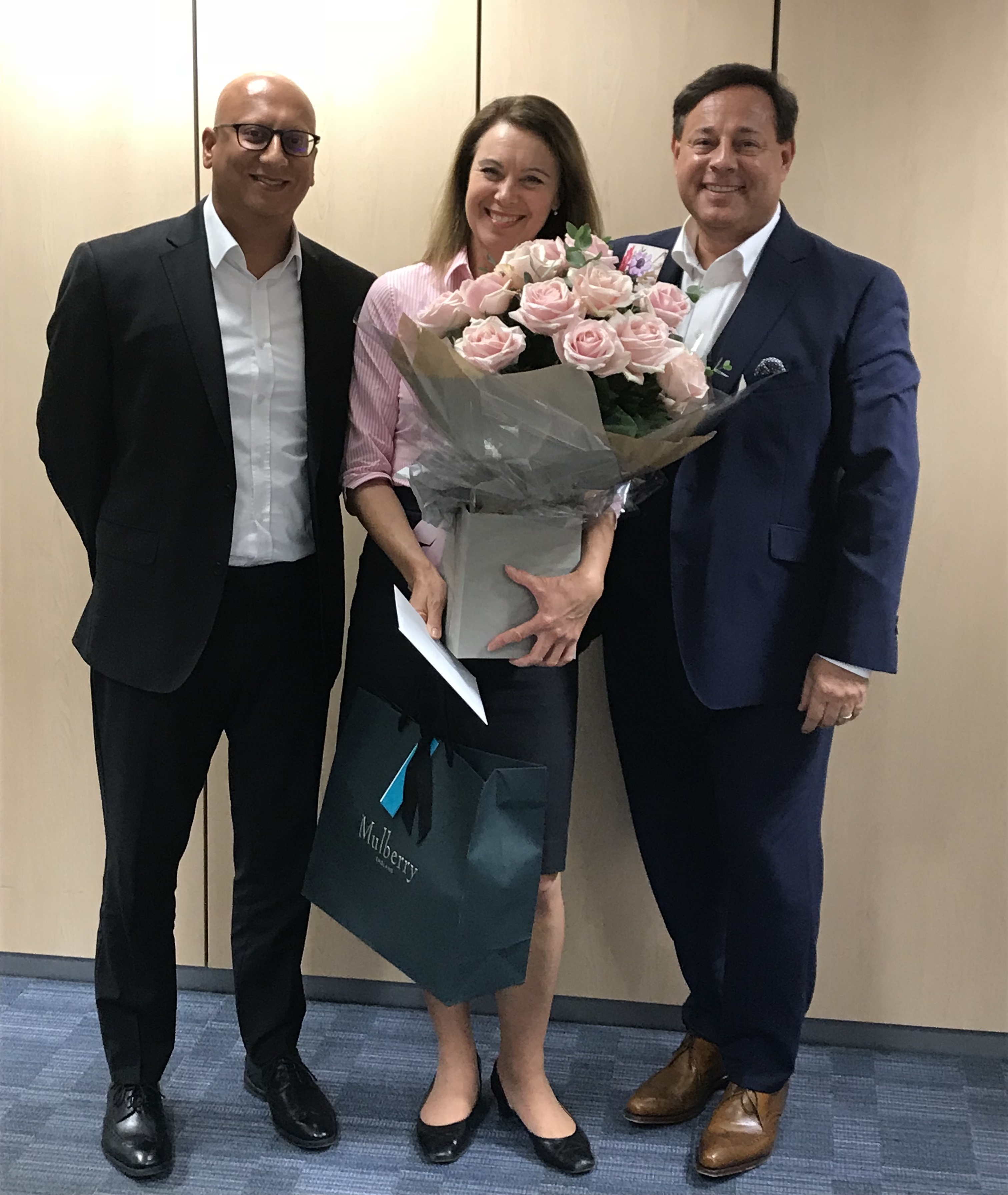 To celebrate her milestone, Mary was presented with 20 pink roses and a stylish Mulberry bag from CACI International's Managing Directors, Shilen Thakker and Dean Nathanson (pictured).