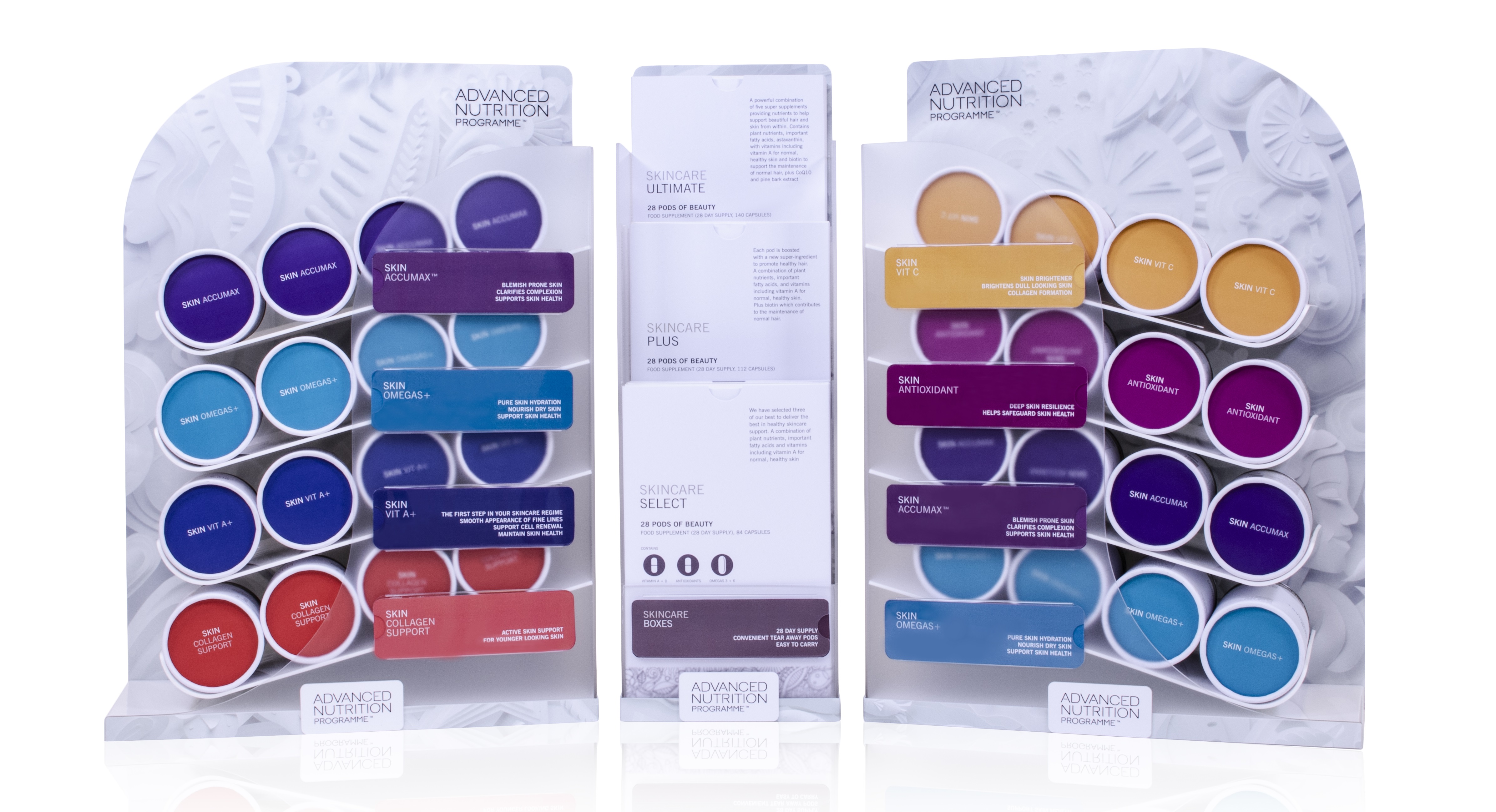 The total ANP display system offers two side modules which can each hold up to 32 single Advanced Nutrition Programme™ pots and a middle unit which can hold up to six Advanced Nutrition Programme™ skincare boxes.