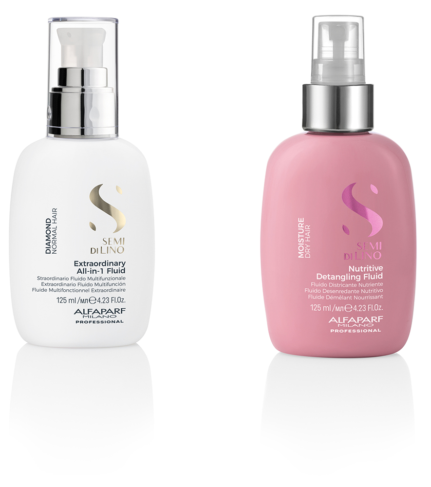 Semi di Lino Diamond Extraordinary All-in-1 Fluid leave-in spray gives instant shine, protects hair against external agents, and counteracts the effect of humidity, whilst Semi di Lino Moisture Nutritive Detangling Fluid leave-in spray detangles and delivers softness and intense nourishment to hair.