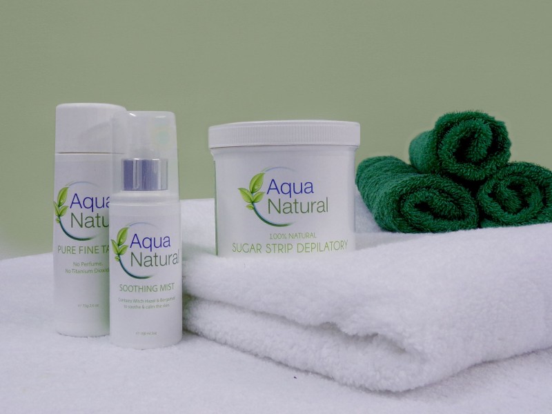 The range consists of the Aqua Natural Jar sugar paste, Pure Fine Talc to prepare the skin before treatment, and Soothing Mist made from spring water, Witch Hazel and Bergamot to clear up any residue or tackiness whilst calming the skin.