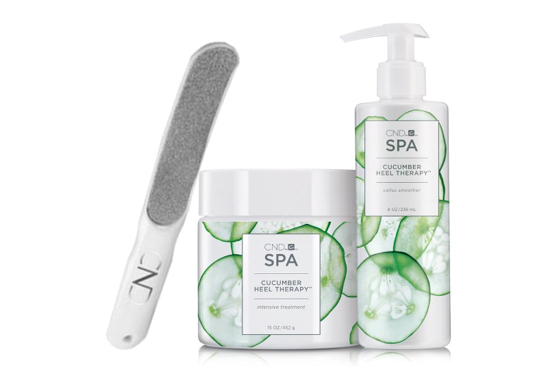 The trio kit includes CND™ Cucumber Heel Therapy Intensive Treatment, Cucumber Heel Therapy Callus Smoother, and a Foot File for a gentle but firm exfoliation.