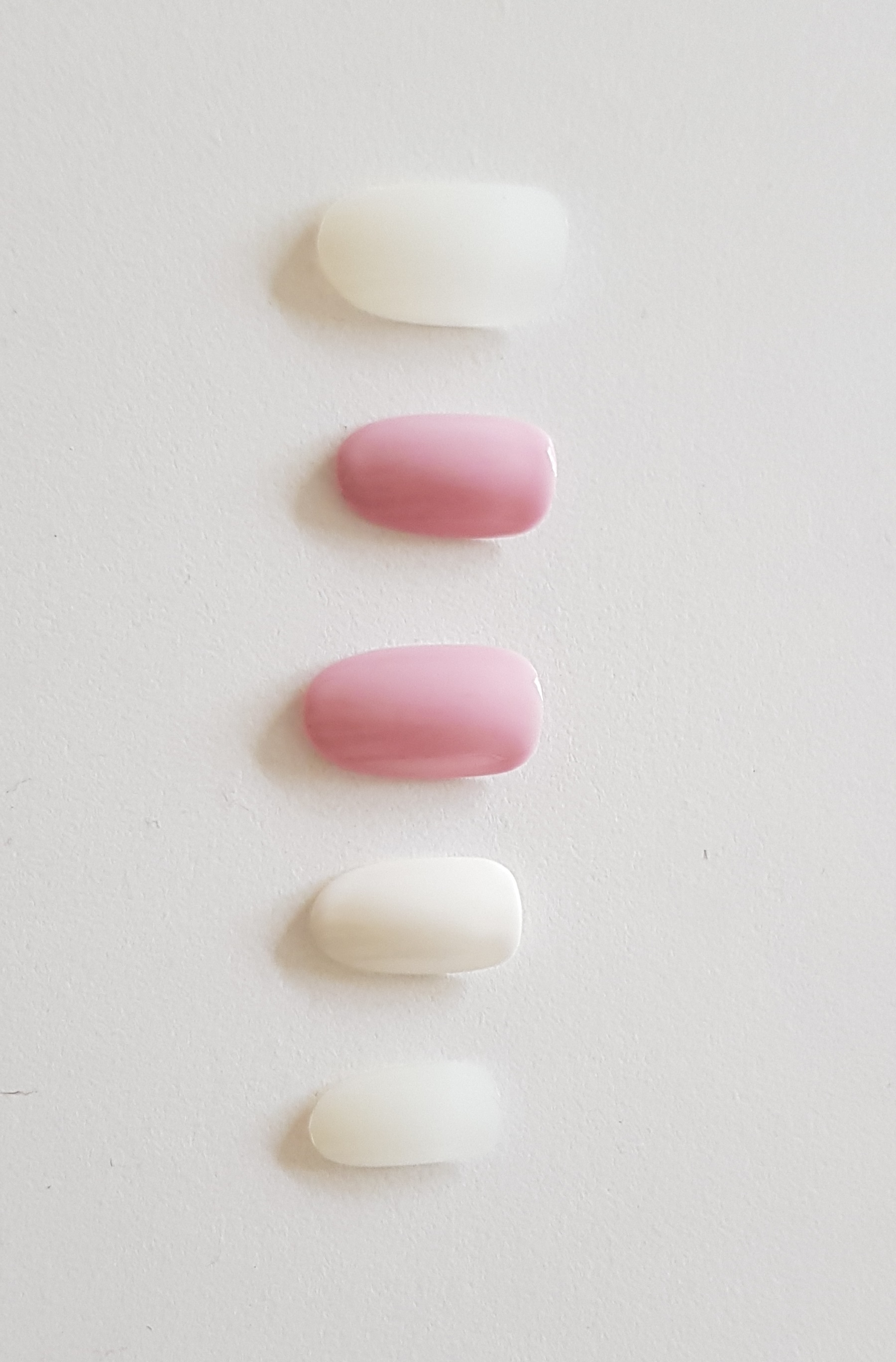 Using Gellux Cherry Blossom and apply your first coat to the Index and Middle finger. Then apply your first coat of Gellux Purely White to the Ring Finger then cure. Repeat these for the second coat and cure.