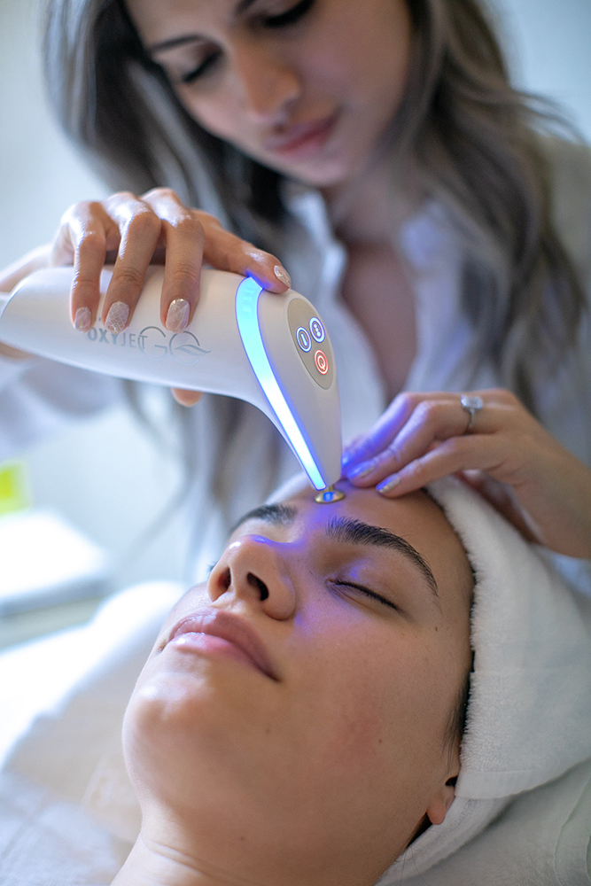 The OXYjet GO uses a pressure pulsed method to deliver microencapsulated oxygen and active serums deep into the dermis to re-energise cells and plump the skin, resulting in a visible reduction in fine lines and wrinkles and a glowing complexion.
