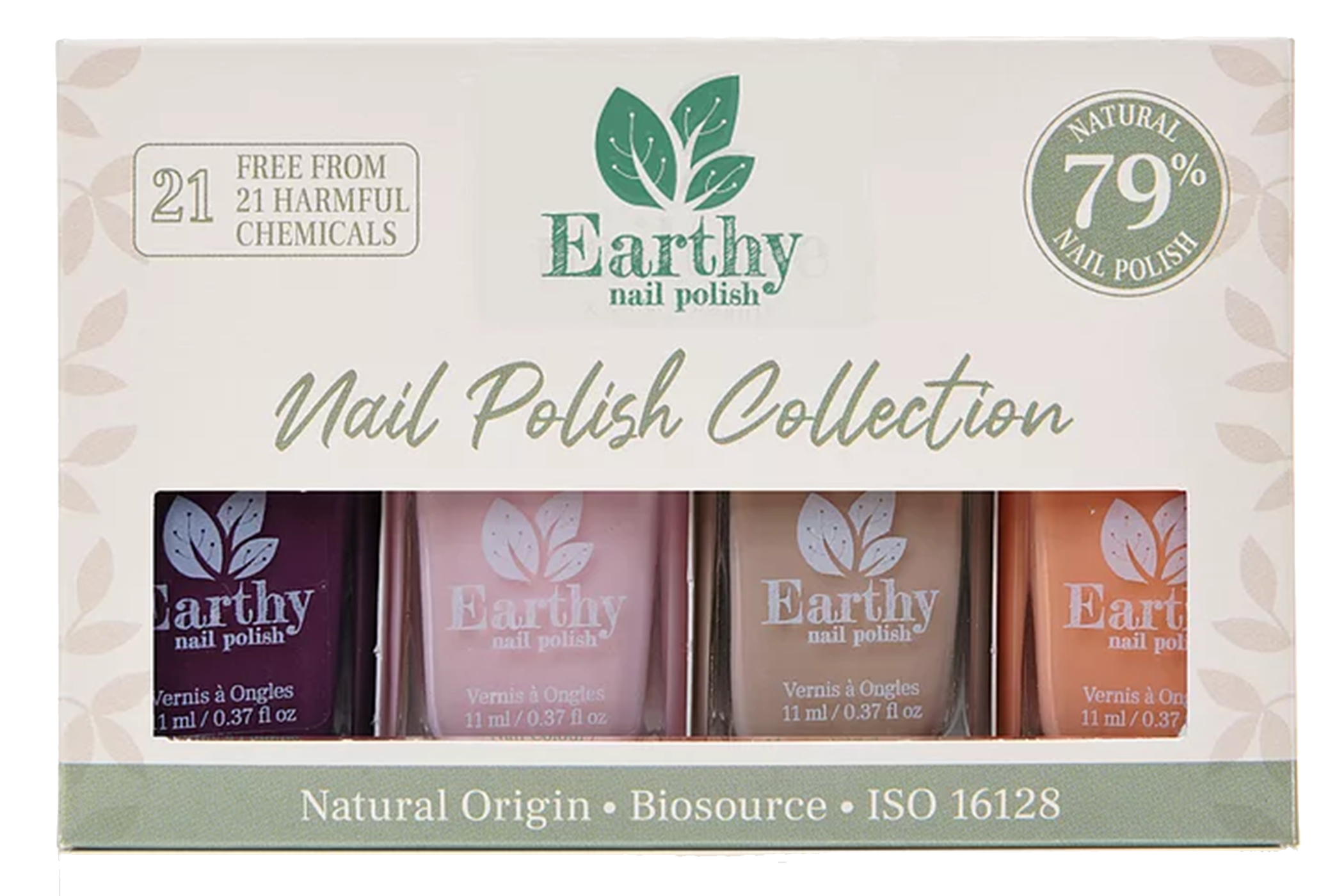 Earthy Nails In Bloom Collection include Damson in Distress, a muted purple; Maya's Rose, a baby pink shade with a soft milky finish; Pearls of Wisdom, a nude with warm undertones; and Peaches & Cream, a peachy shade that complements all skin tones and a summer tan.