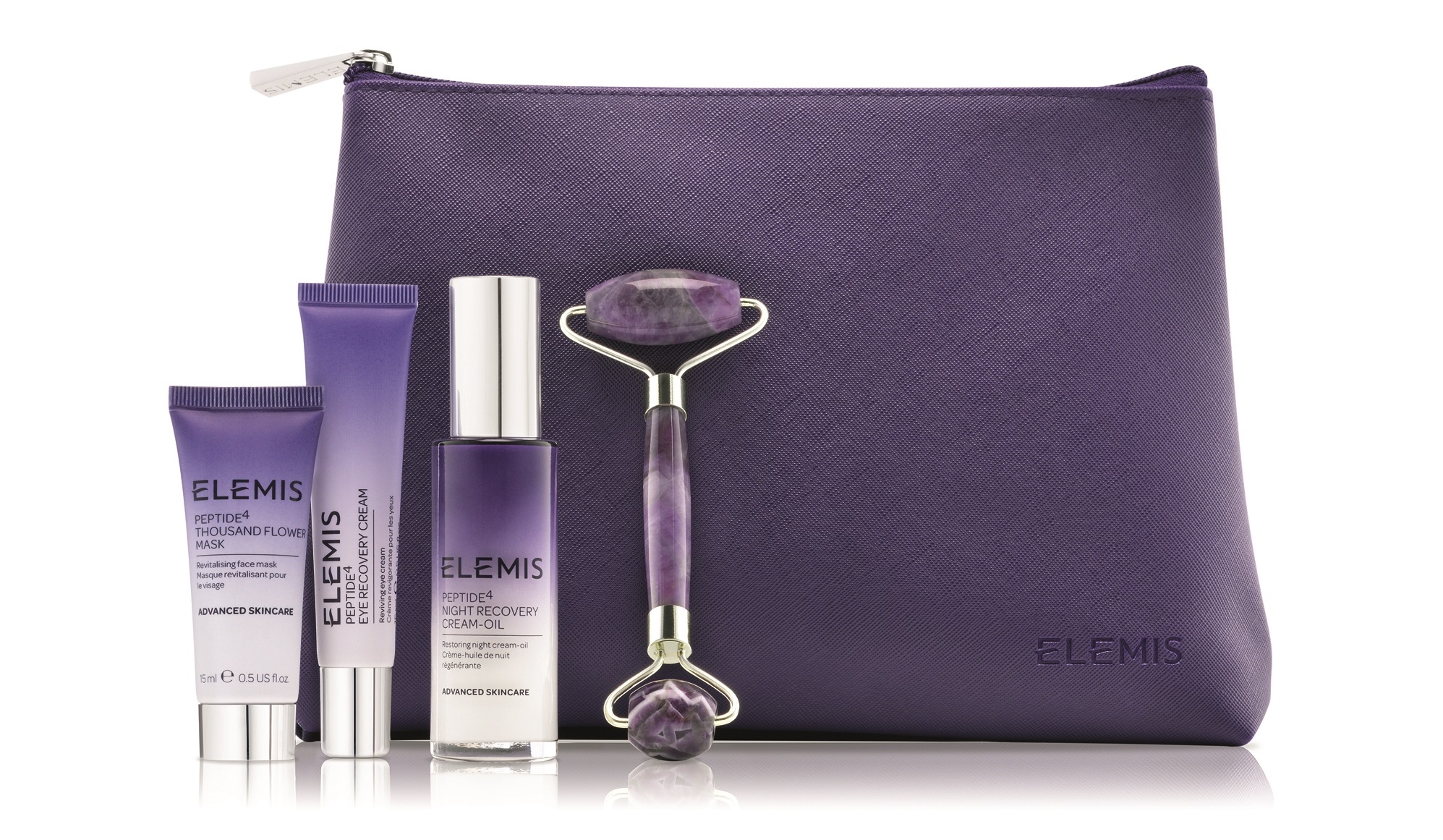 The Elemis Peptide 24/7 Amethyst Face Roller Collection includes the Amethyst Roller along with Peptide4 Night Recovery Cream-Oil 30ml, Peptide4 Thousand Flower Face Mask 15ml, and Peptide4 Eye Recovery Cream 15ml.