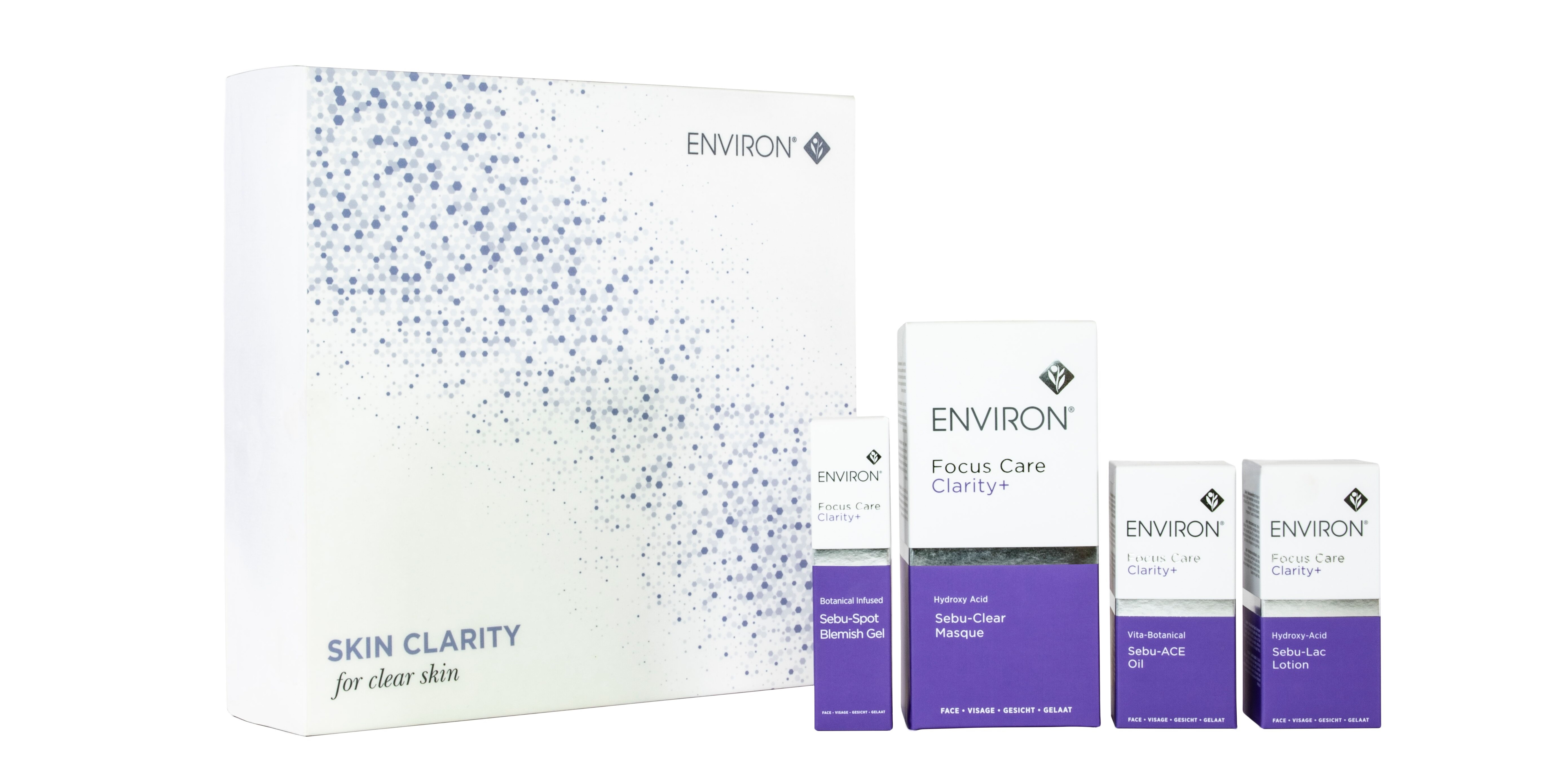 For skin experiencing breakouts, The Environ® Skin Clarity Kit delivers comfort-enhancing benefits to leave skin feeling smoother, healthier and radiant. The kit includes Focus Care™ Clarity+ Hydroxy Acid Sebu-Lac Lotion, which helps to combat signs of breakouts and improve skin texture and tone, Focus Care™ Clarity+ Vita-Botanical Sebu-ACE Oil to control the appearance of blemishes, Focus Care™ Clarity+ Hydroxy Acid Sebu- Clear Masque, and targeted Focus Care™ Clarity+ Botanical Infused Sebu-Spot Blemish Gel to improve the appearance of visible spots and blemishes.