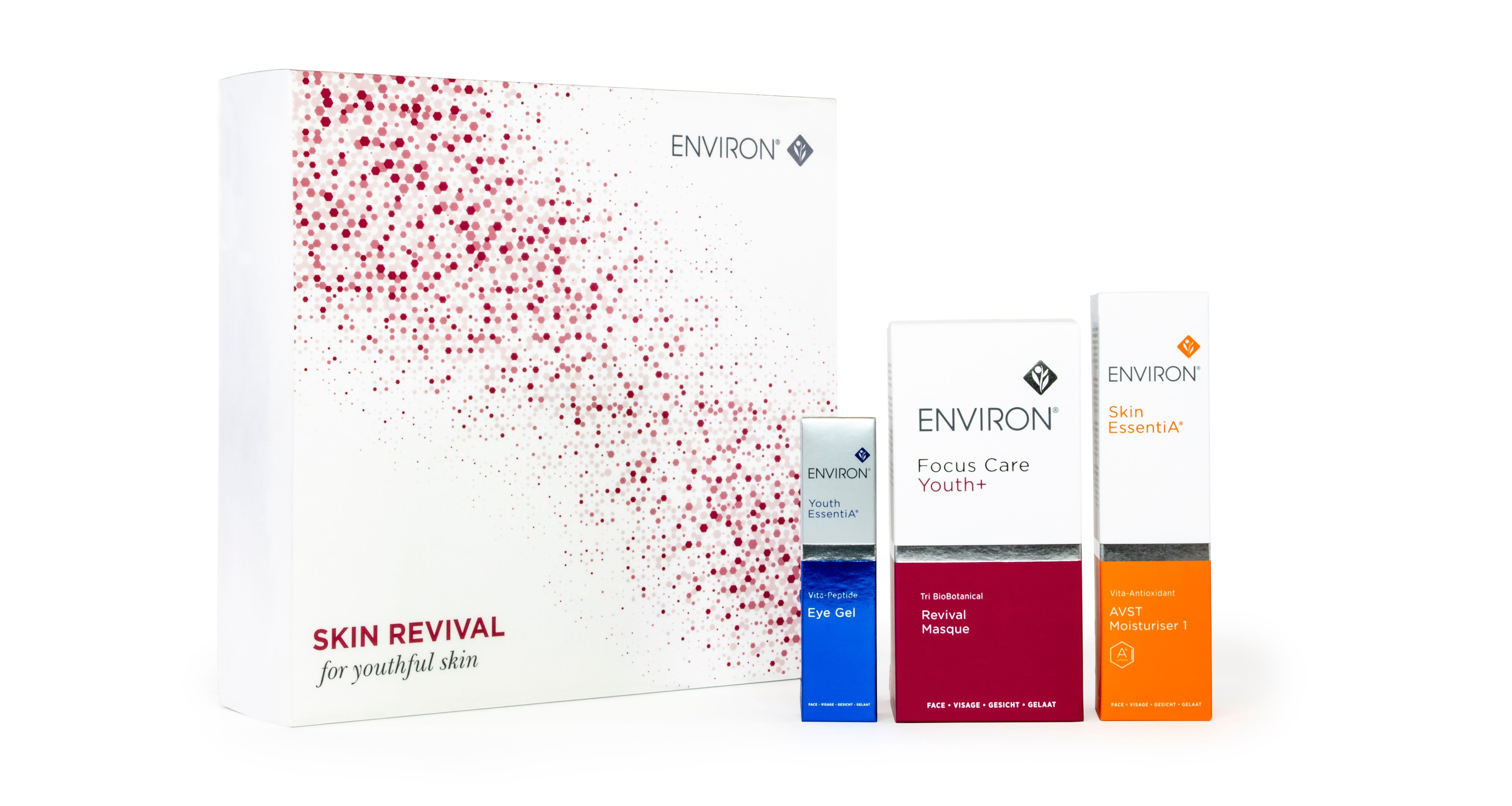 The Environ® Skin Revival Kit (pictured above) targets signs of skin ageing with scientifically researched formulations. This kit includes Skin EssentiA® Vita-Antioxidant AVST Moisturiser (1-5) featuring vitamins A, C and E to stimulate the production of Collagen and Elastin, Focus Care™ Youth+ Tri BioBotanical Revival Masque, and Youth EssentiA® Vita-Peptide Eye Gel, a formulation of peptides and antioxidants which improve skin hydration, tone and elasticity.