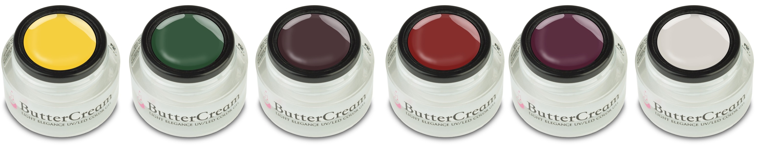 The collection of creamy nail gels include cream-yellow, camouflage green, rich brown taupe, dusty brick red, dark black purple, and cream bone white.