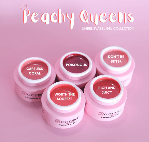 Now, Glitterbels like to stay ahead of the trends so it makes sense that we created a collection filled to the brim with gorgeous peach shades. The “Peachy Queens” collection from the Glitterbels Unbelievabel gel range is the one place to find a variety of beautiful peach-coloured gels.