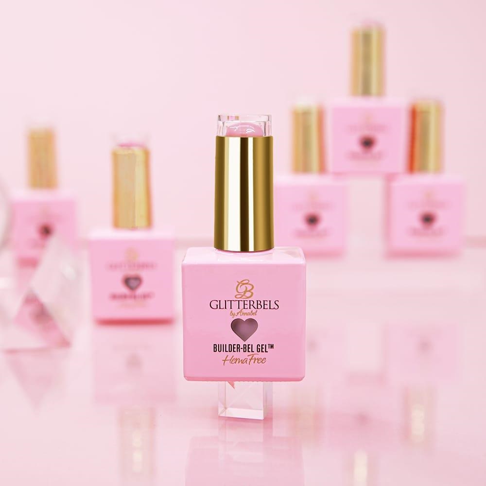 Glitterbels' Hema Free Builder-bel Gel is compatible with soak-off gels and hard gels as well as acrylic enhancements and natural nails, delivering nail strength and flexibility. It is Hema-free, vegan and cruelty-free, and is easily applied with or without a bonding agent. It soaks off without any damage to the natural nail bed.