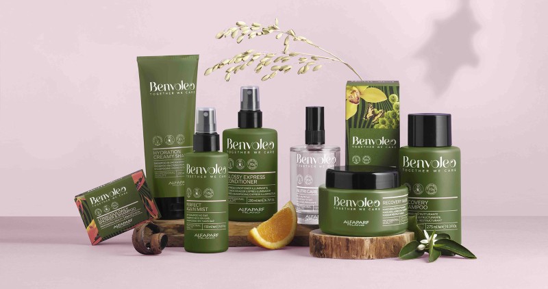 Alfaparf Milano's Benvoleo collection comprises four main care lines: Daily, Glossy, Hydration and Recovery, along with a professional in-salon line and finishing products. Products include solid and liquid shampoos, conditioners, a hair mask, detangling leave-in treatment, heat repair spray, a leave-in hair oil and a refreshing mist along with in-salon booster shots of concentrated ingredients mixable with conditioners.