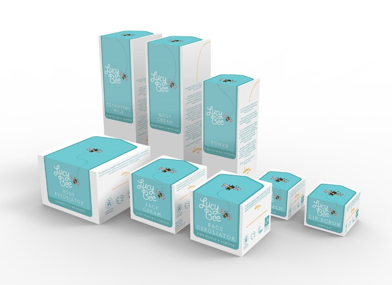 The Lucy Bee skincare range includes Pink Pepper & Juniper Face Cream, Pink Pepper & Juniper Face Exfoliator, Pink Pepper & Juniper Cleansing Milk, Grapefruit & Mandarin Body Cream, Grapefruit & Mandarin Body Exfoliator, Vanilla Lip Balm, and Vanilla Lip Scrub.