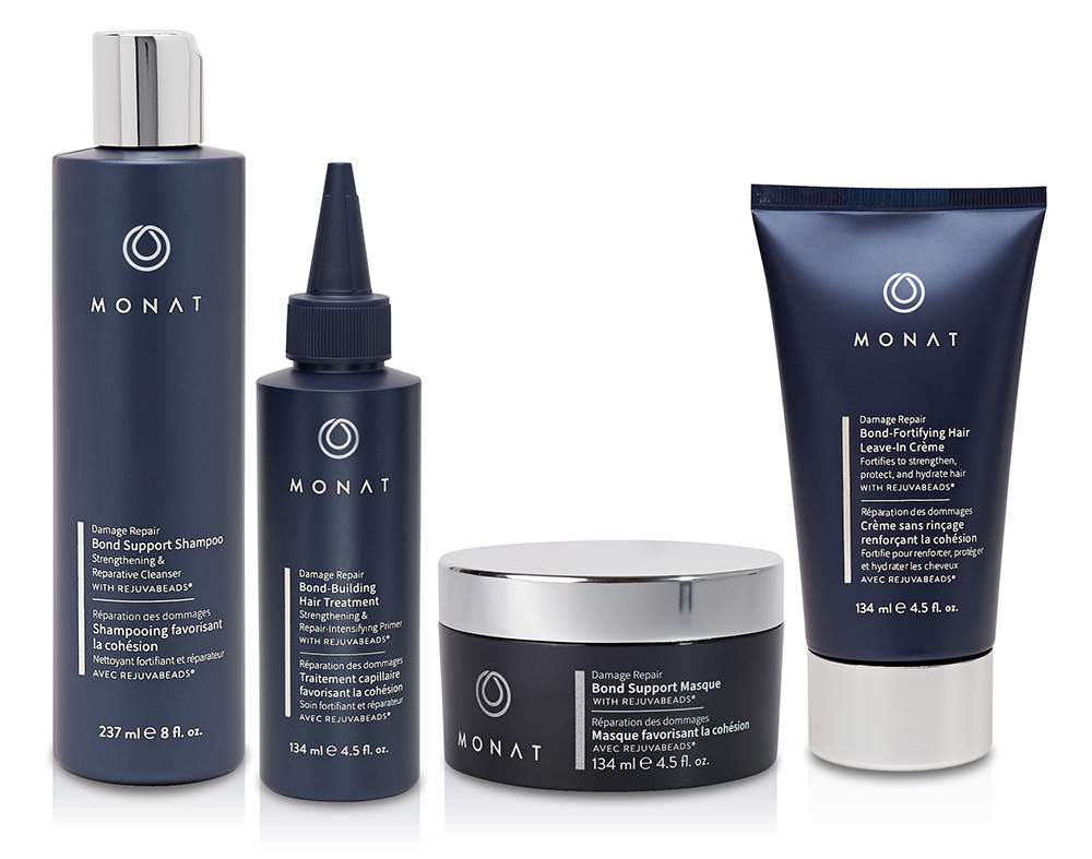 Monat Damage Repair Bond Support Shampoo that cleanses whilst instantly strengthening the hair, Damage Repair Bond-Building Hair Treatment, a water-gel conditioning serum that repairs damage at the hair's core to reduce breakage, Damage Repair Bond Support Masque, a deeply conditioning reparative masque that softens and instantly bonds hair fibres, and Damage Repair Bond-Fortifying Hair Leave-In Crème that reduces breakage from brushing and combing while strengthening.