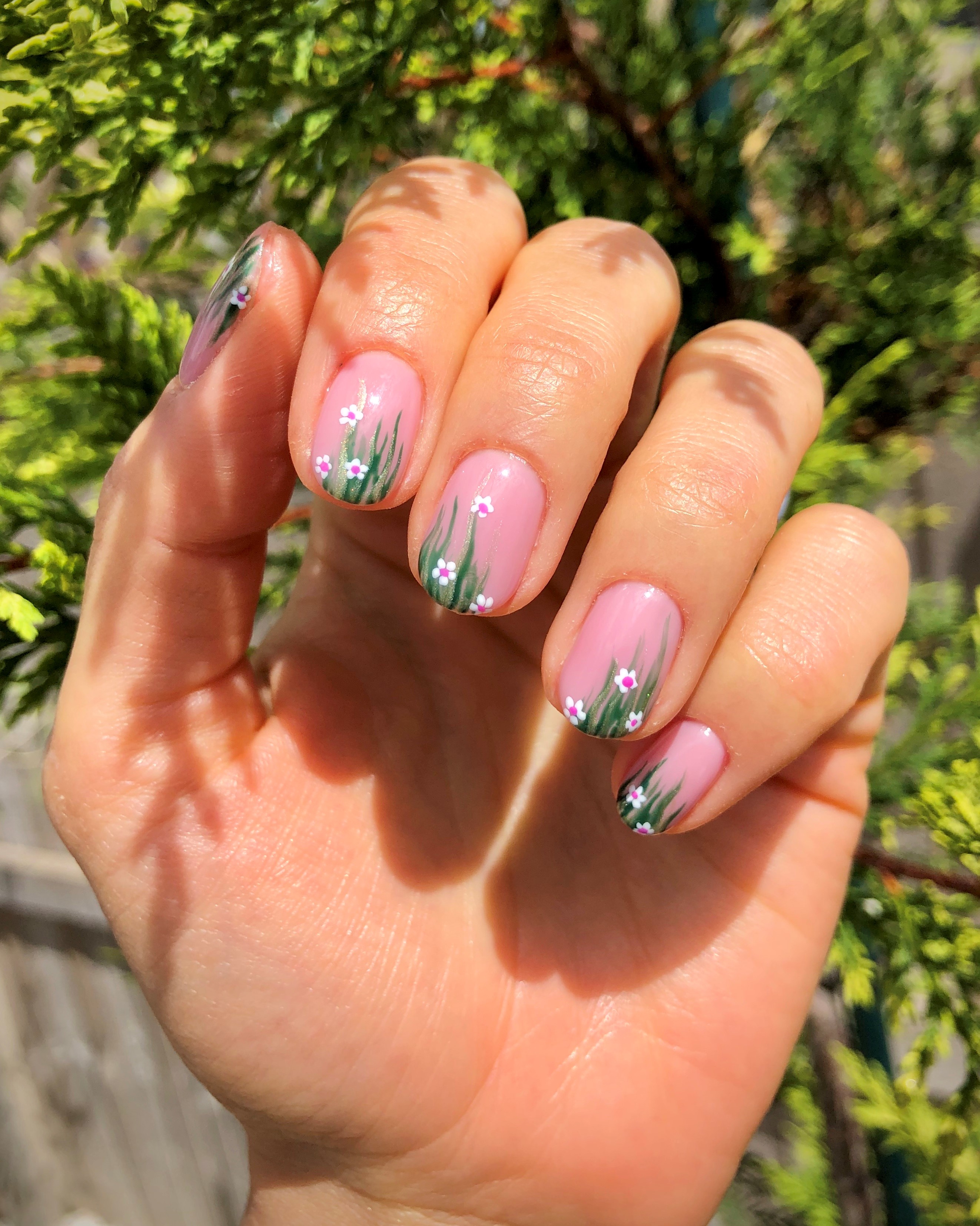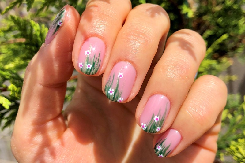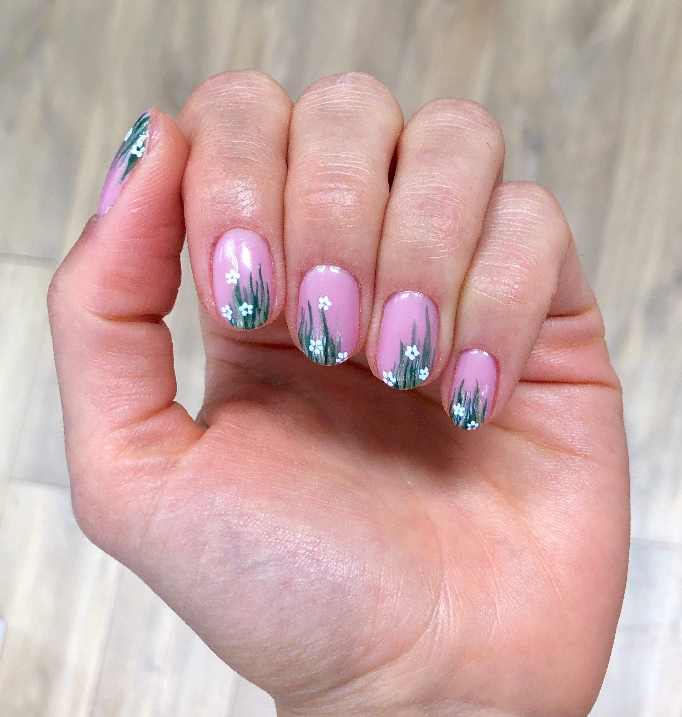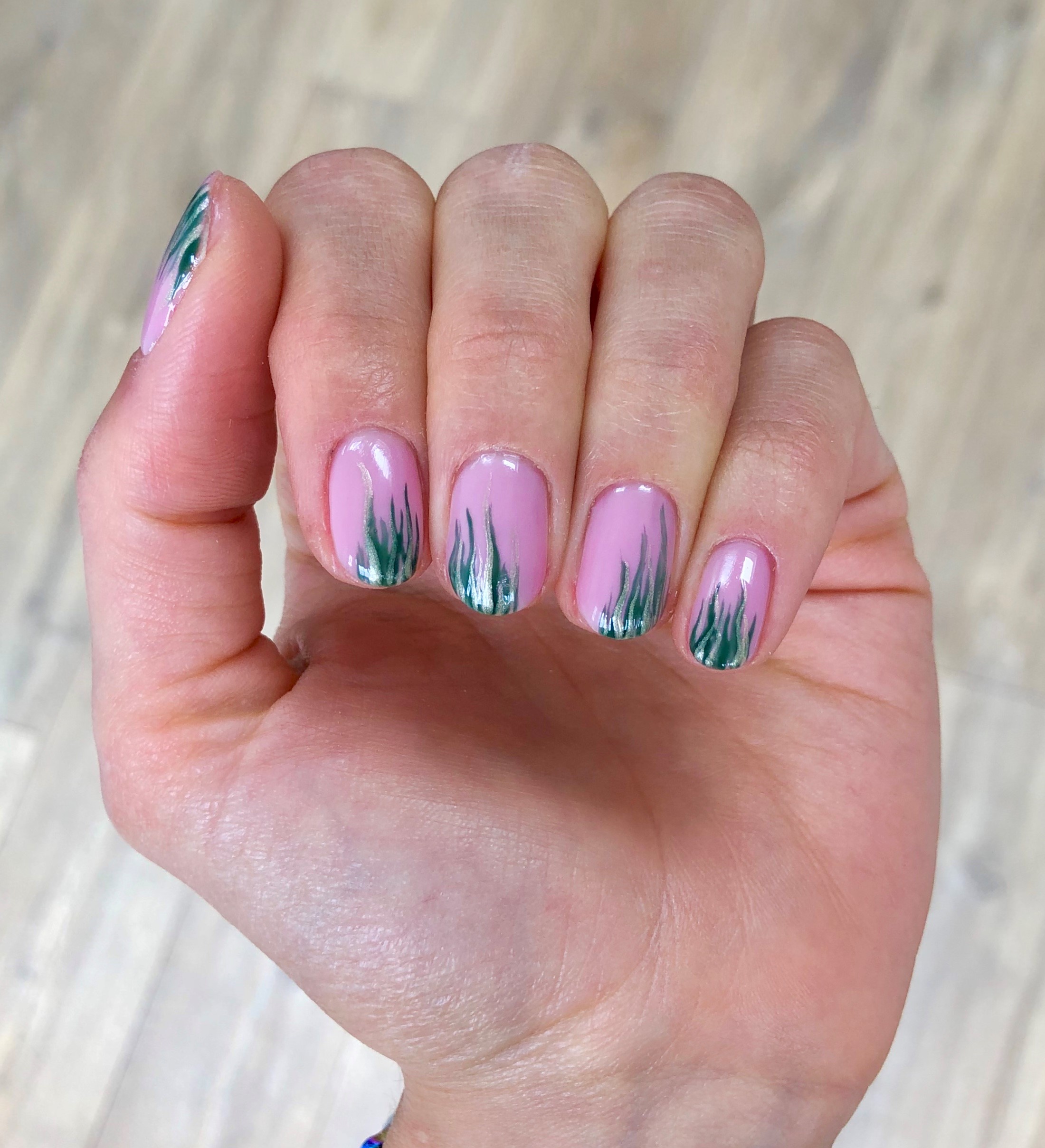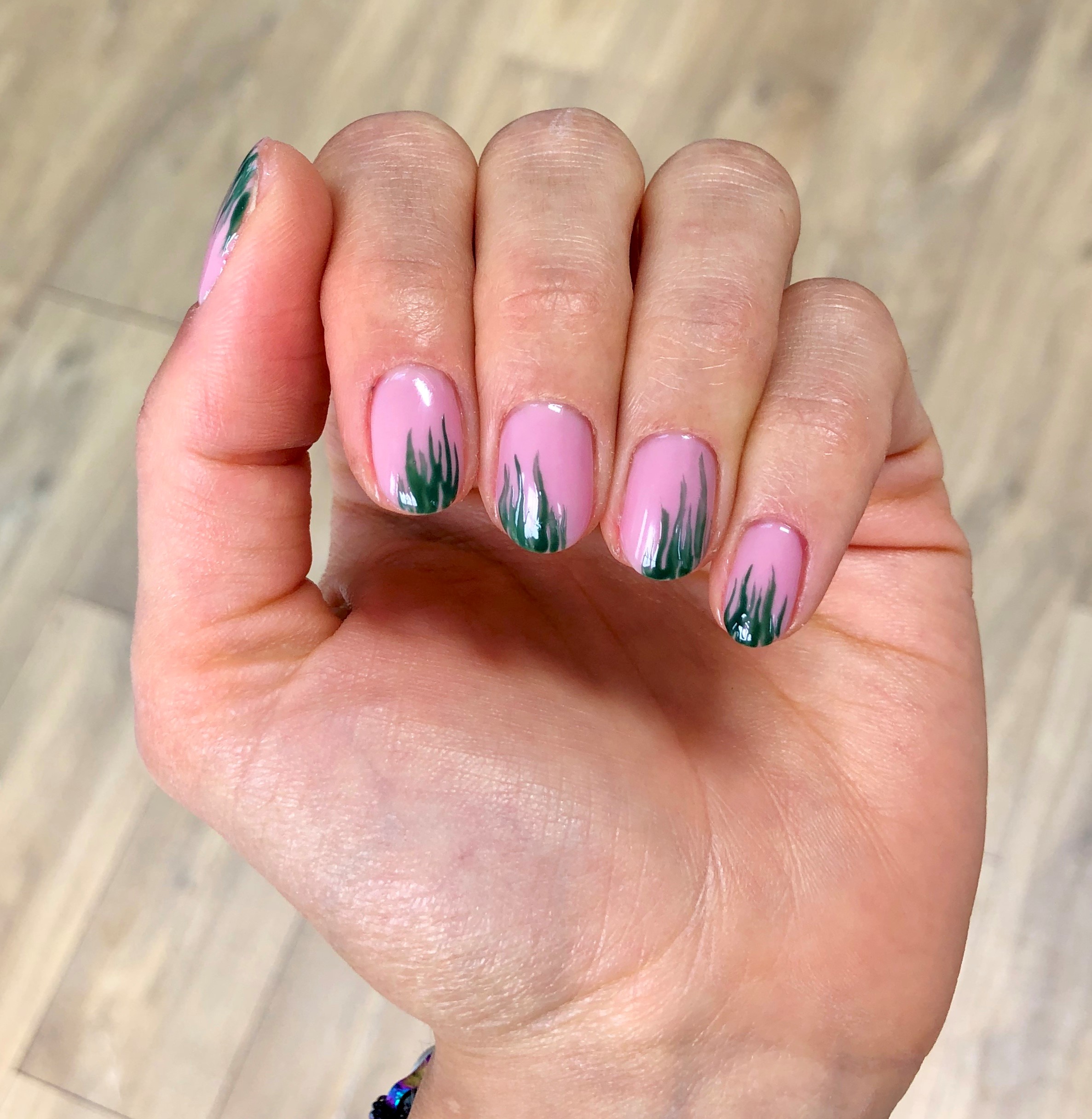 Using a nail art brush dipped in Gellux Rush Hour, create some grass blades on each nail, cure.