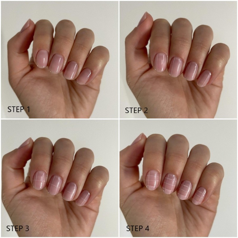 Using Gellux Slumber Party and a fine liner nail art brush, paint two lines vertically down each nail and cure.