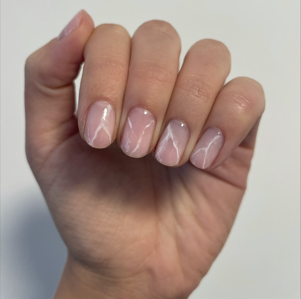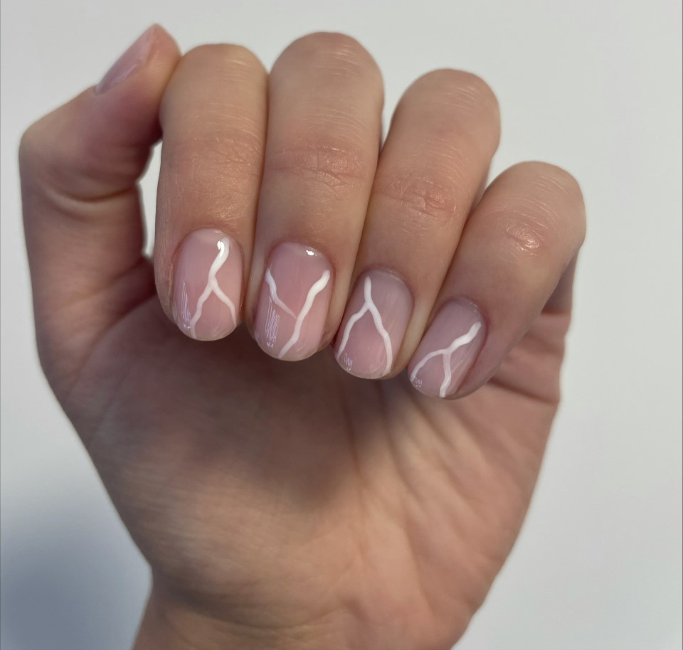 Then apply one very thin layer of Gellux Builder Gel in Light Pink, curing for 60 seconds between each coat. Using a fine liner and Gellux Purely White, paint some wiggly line onto each nail, do not cure.