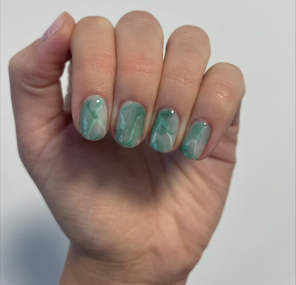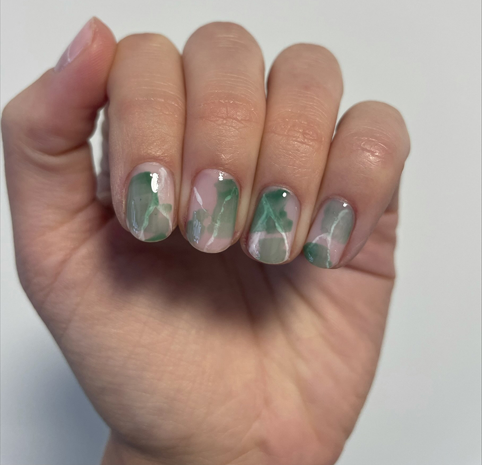 Next, paint over the nail with a thin coat of Gellux Builder Gel in Cool White, and smudge in some Gellux Lucky Shamrock, and cure for 60 seconds.