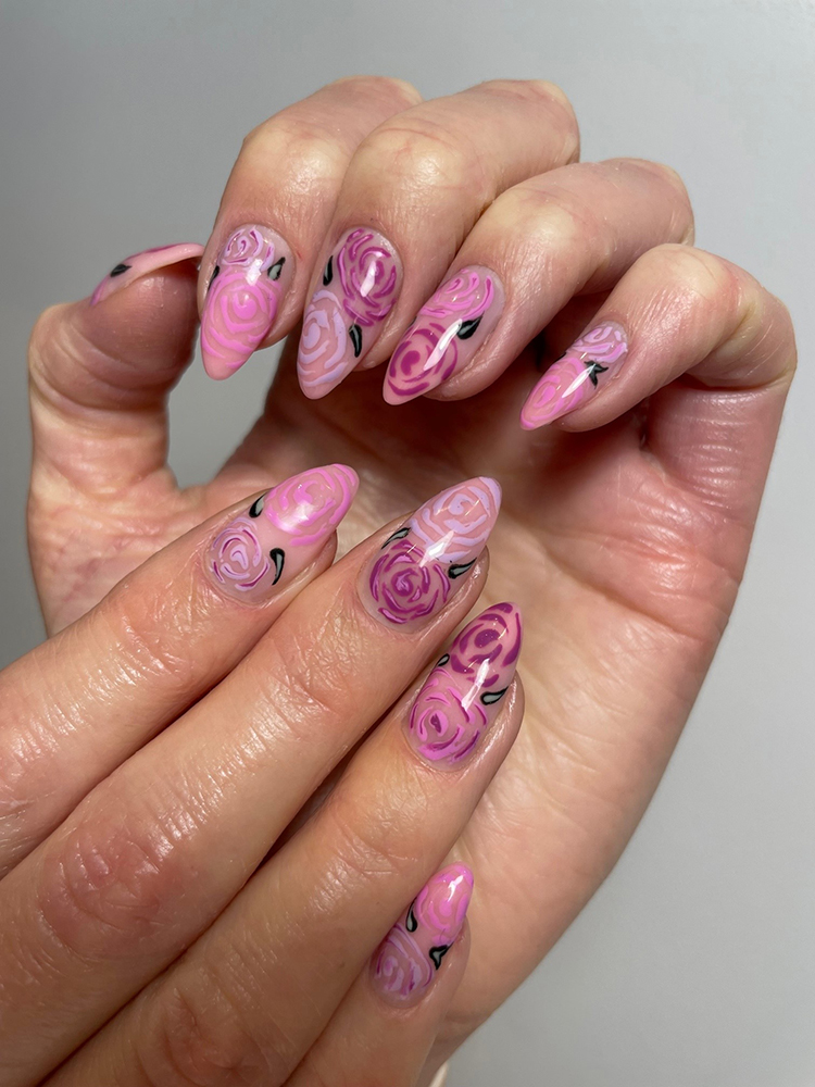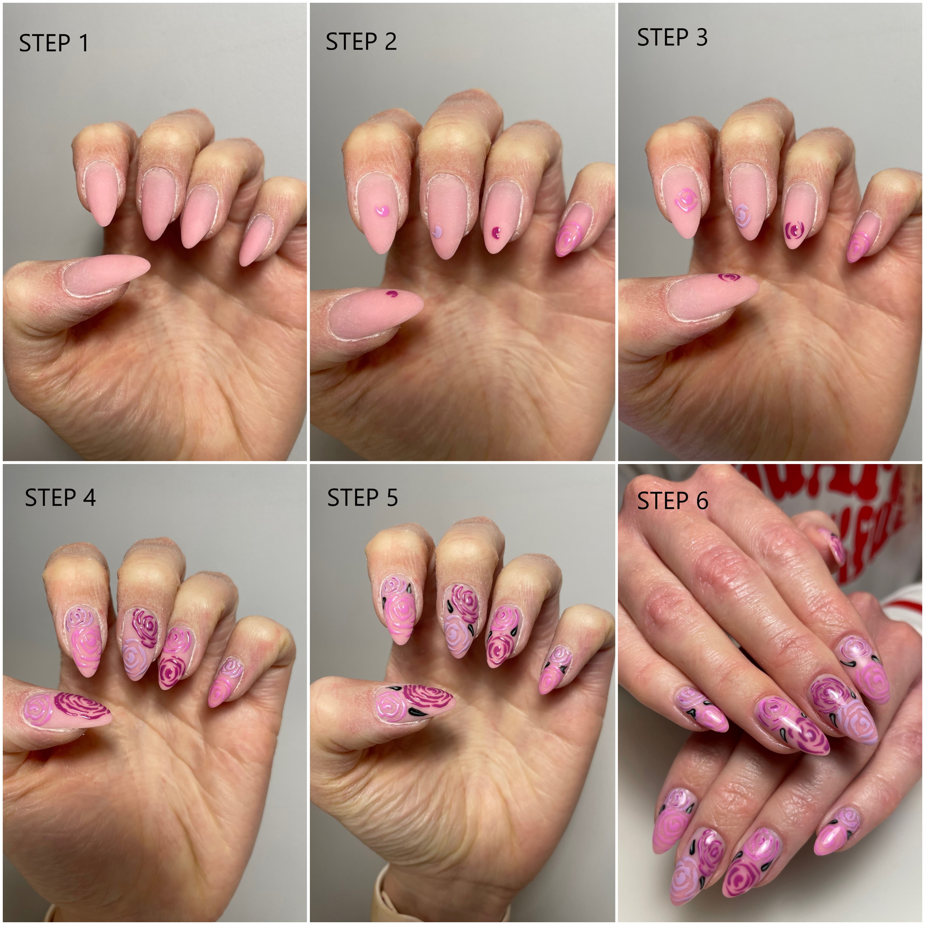 Using the same colours for each of the fingers, use a thin liner art brush to create squiggles in a staggered circle to create that rose look.
