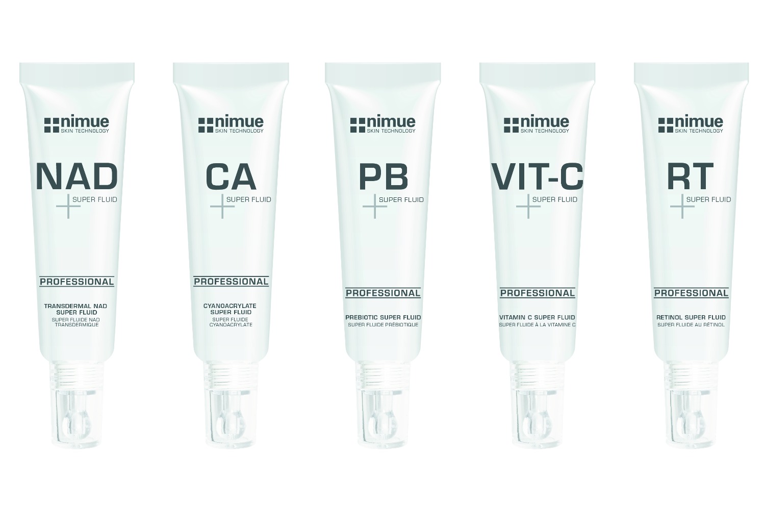 The Nimue SuperFluids range includes Nimue Retinol SuperFluid for the treatment of fine lines and wrinkles as well as age spots; Vitamin C SuperFluid (microencapsulated) for hyperpigmented skin and dull complexions; Prebiotic SuperFluid for the treatment of problematic and acne-prone skin; Transdermal NAD (Nicotinamide Adrenaline Dinucleotide) SuperFluid for use on dull skin with signs of wrinkles and sagging; and Cyanoacrylate SuperFluid, patented to Nimue, for treating sensitised and inflamed skin.