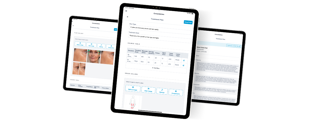 A patient's treatment journey can be documented with the addition with before-and-after photos, markup and comparison images. In addition, treatment specifics such as laser settings and patient progress can be reported through the Course Tables feature.