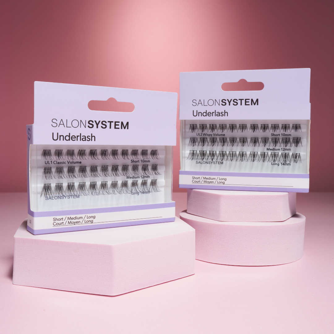 Salon System Underlash features Classic Volume and Wispy Volume styles. Each is available in individual packs of clusters and well as mixed sizes of 10mm, 12mm and 14mm lengths. Also new are Salon System Underlash 7 Day Bond and Salon System Underlash Remover.