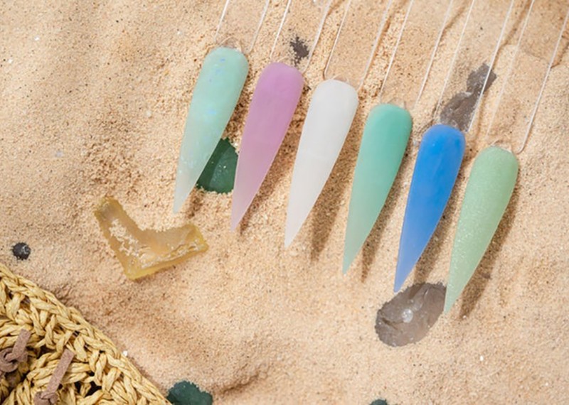 The collection of six new jelly dip powder shades is inspired by various shades of sea glass, a type of natural frosted glass that is found washed up on beaches.