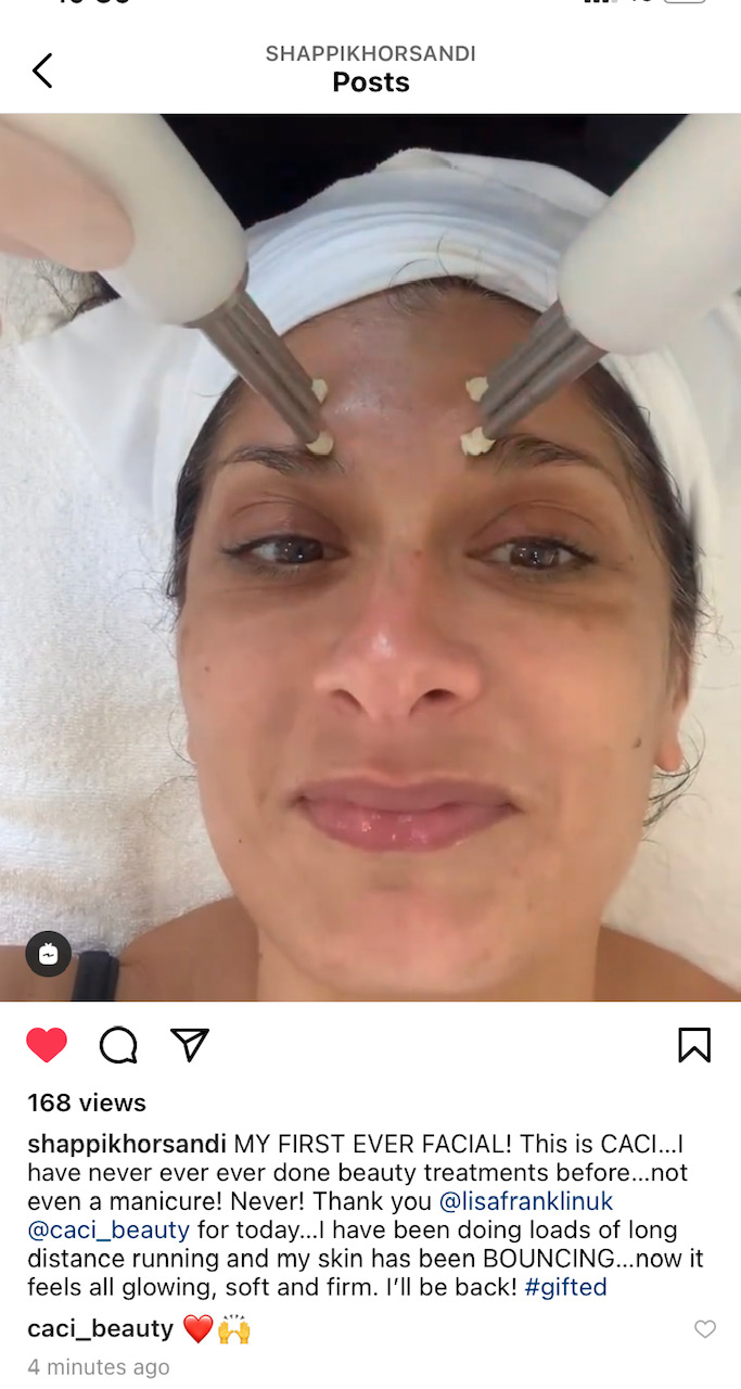 Shappi, who confessed she is new to salon treatments, enjoyed her first professional facial with the choosing CACI Synergy at CACI's London flagship salon, Lisa Franklin Clinic Privé in Knightsbridge.