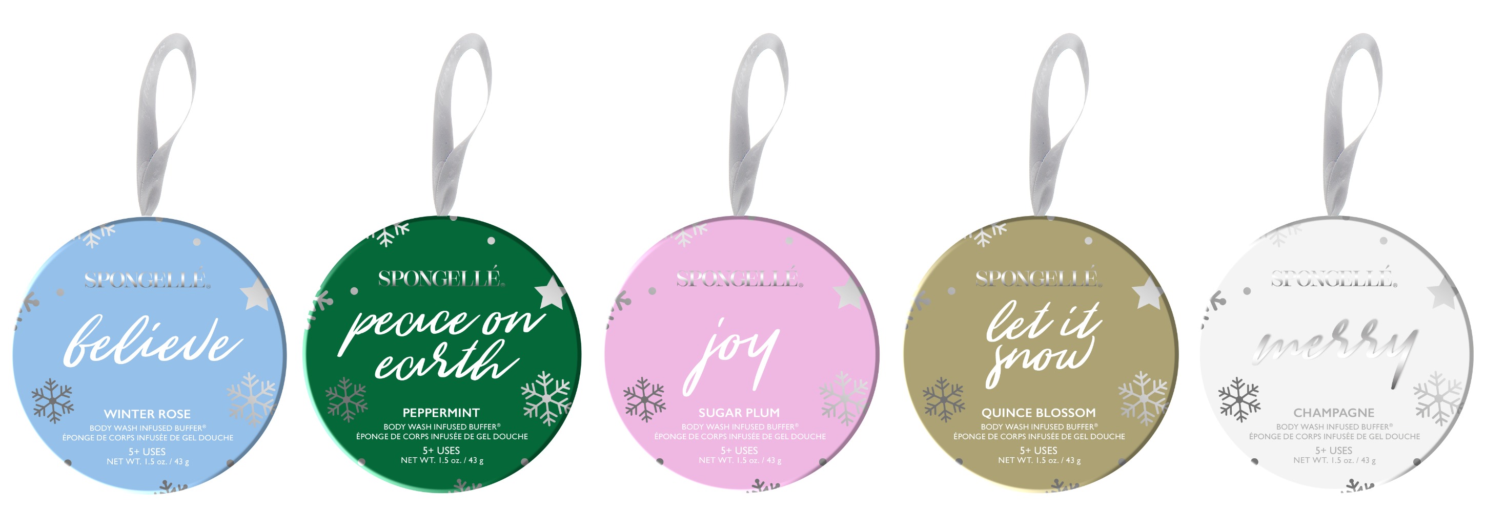 A new range of Spongellé hanging ornaments has also been introduced for retailing, perfect for hanging from your salon tree! Each delivers up to five washes of rich body wash in Merry Champagne, Peace on Earth Peppermint, Naughty or Nice Pomegranate, Let It Snow Quince Blossom, Joy Sugar Plum and Believe Winter Rose fragrances.