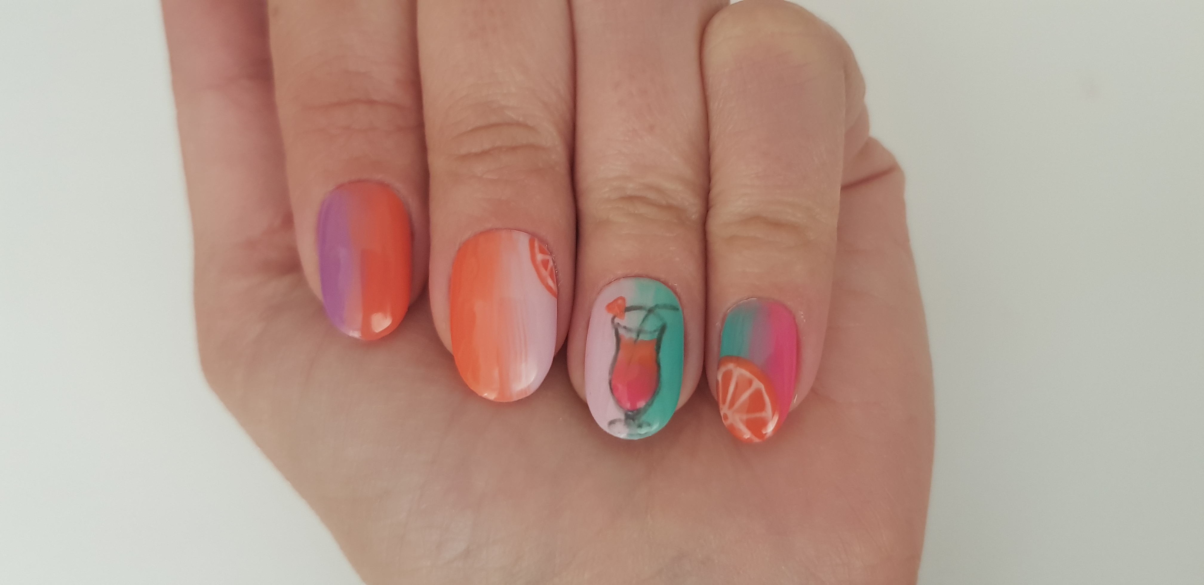 Using Gellux Boy Trouble, create your orange slice on the middle finger and pinky, also a small orange slice to decorate the glass, then cure under a UV or LED lamp.