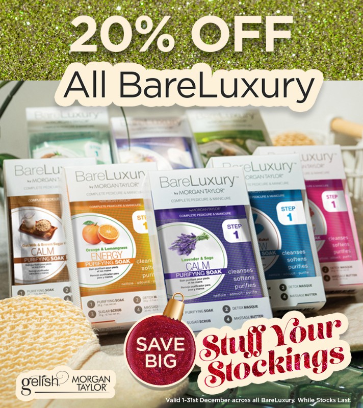 Stuff Your Stockings With 20% OFF the BareLuxury™ range this December. BareLuxury™ is a 4-step system that offers dramatic professional results for feet and hands, taking you from chaos to calm! BareLuxury™ cleanses, detoxifies, refines and leaves skin glowing. BareLuxury™ takes a holistic approach with fragrances and formulas designed for the ultimate sensory experience. Dramatic, professional results for customized mood-altering services in spa safe, non-staining, clean-rinse formuals. We believe that nothing is more essential to healthy, enlightened living than taking time to rejuvenate the skin and senses.